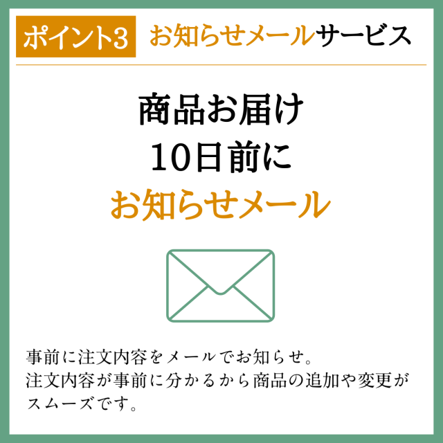 ・解約、商品お届けの変更等は、お届け予定日の7日前までにご連絡ください。 (マイページからのお手続きかお電話で承ります。)